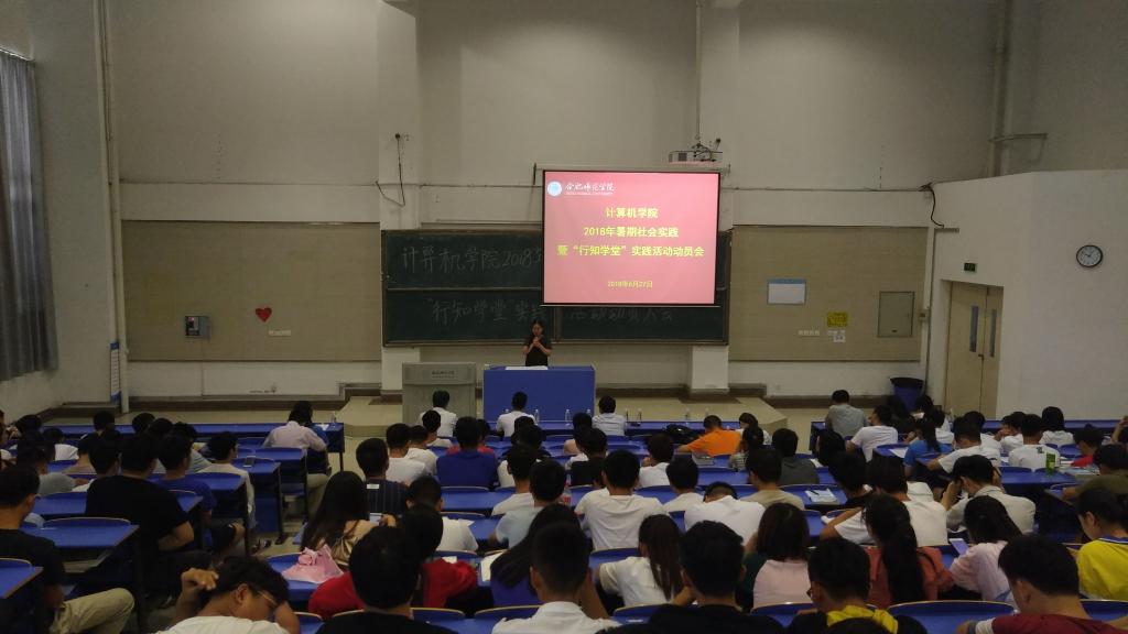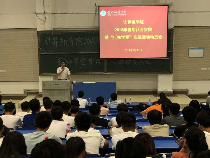 6月27日中午,计算机学院2018年暑期社会实践暨“行知学堂”实践活动动员会在锦绣校区逸夫楼西阶一教室举行,计算机学院党总支书记孔凯、副院长谢飞、合肥市包河区滨湖竹园社区陈妍嫣、计算机学院党总支兼行政秘书尹陈、全体辅导员和2017级学生约200多人参加了会议。会议由分团委指导教师吴晓星主持。