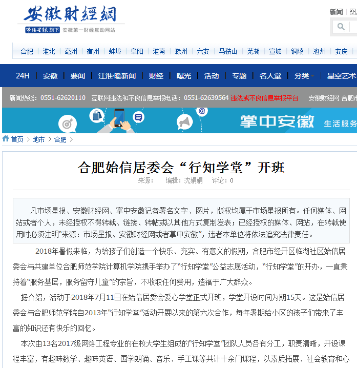 7月11日,安徽财经网对我院计算机学院举办的“行知学堂”进行了报道。(计算机学院:星辰)