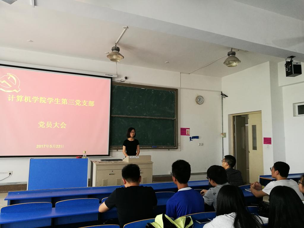5月22日中午,计算机学院学生第一、第二、第三党支部分别在逸夫楼A207、A206、A205教室召开接收预备党员及预备党员转正大会,学生党支部书记贺晶晶、胡兵、解新为及全体学生党员、预备党员参加了本次大会。会议由三个学生党支部书记分别主持。