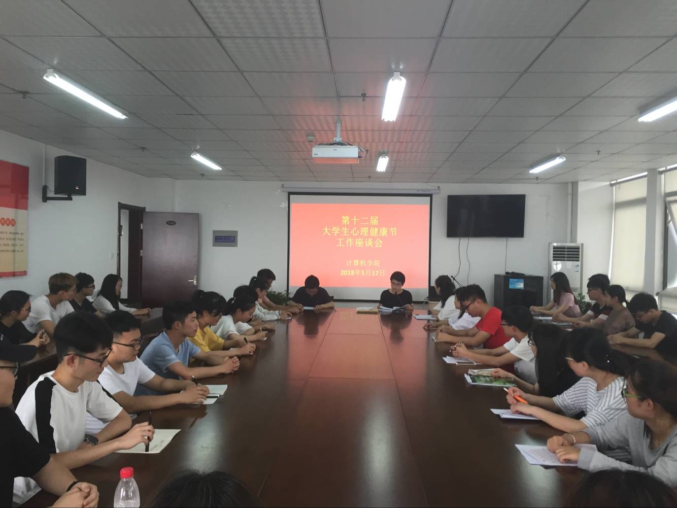 为积极响应学校第十二届大学生心理健康节的号召,掌握学生心理动态,普及心理健康知识,5月18日中午计算机学院在行知楼1302会议室召开了心理委员工作推进座谈会,学院分团委书记吴晓星、全体辅导员、院学生会心理部成员、自律委员会部分成员、各班心理委员参加了本次会议。会议由负责老师贺晶晶主持。
