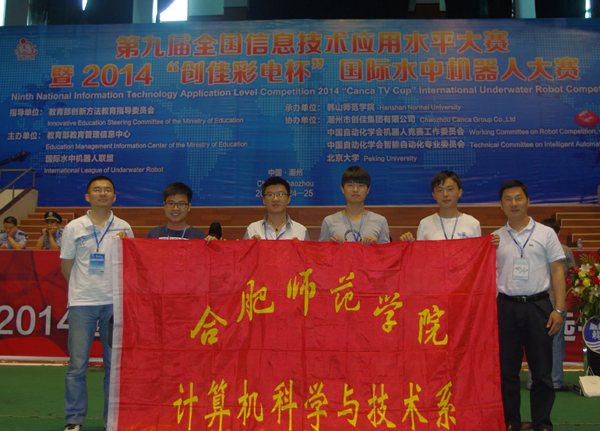 5月25日,由教育部教育管理信息中心主办的“第九届全国信息技术应用水平大赛暨2014‘创佳彩电杯’国际水中机器人大赛”在广东省潮州市落下帷幕,由我院范庆春、王凡两位老师指导,马有志、任争明、石涛和朱毛赛等同学组成的合肥师范学院Lotus队经过激烈角逐,在抢球博弈项目闯进八强获得二等奖,在协作过孔项目获得二等奖,同时斩获了教育部主办的“第九届全国信息技术应用水平大赛”花样游泳项目三等奖,为学校和我院争得了荣誉。